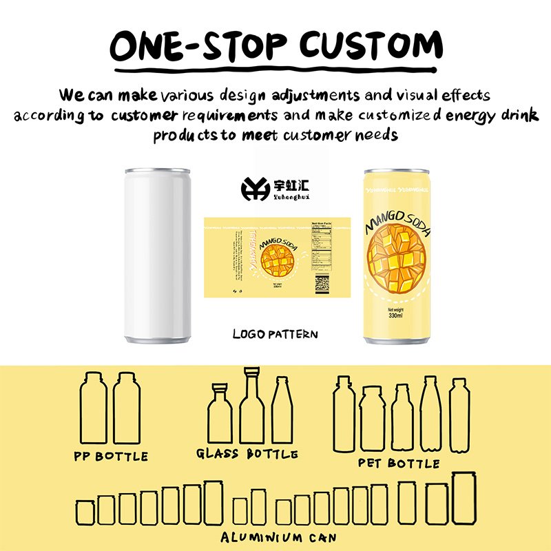 Since its establishment, Yuhonghui has focused on the research and development and production of high-quality beverages, always adhering to the brand concept of "natural, delicious, and innovative". In the raw material procurement link, we have established a strict screening mechanism and cooperated with high-quality raw material suppliers such as mango planting bases for a long time to ensure that every kind of raw material is natural and high-quality. In terms of production technology, we have invested a lot of resources, introduced advanced production equipment, and set up a professional R & D team to continuously explore new flavor combinations and production processes, striving to transform natural raw materials into delicious beverages. We are not only committed to providing high-quality beverages for end consumers, but also can provide customized OEM services according to different customer needs, from product formulation, packaging design to production and delivery, to fully help partners expand their business and achieve win-win results. Choosing Yuhonghui 330ml SLEEK can mango-flavored soda is to choose a refreshing experience that combines natural and delicious, and combines health and enjoyment, making every drink a pleasant journey for both taste and body and mind.