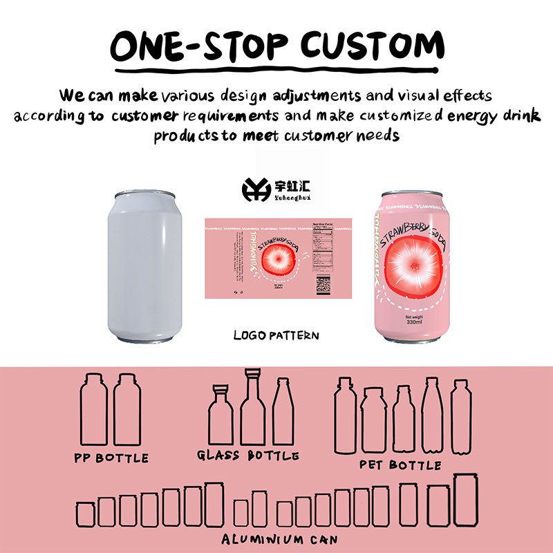 Since its establishment, Yuhonghui has focused on the research and development and production of high-quality beverages, always adhering to the brand concept of "natural, delicious, and innovative". In the raw material procurement link, we have established a strict screening mechanism and cooperated with high-quality raw material suppliers such as strawberry planting bases for a long time to ensure that every kind of raw material is natural and high-quality; in terms of production technology, we have invested a lot of resources, introduced advanced production equipment, and set up a professional R & D team to continuously explore new flavor combinations and production processes, striving to transform natural raw materials into delicious beverages. We are not only committed to providing high-quality beverages for end consumers, but also can provide customized OEM services according to different customer needs, from product formulation, packaging design to production and delivery, to fully help partners expand their business and achieve win-win results. Choosing Yuhonghui 330ml standard can strawberry-flavored soda is to choose a refreshing experience that combines natural and delicious, and combines health and enjoyment, making every drink a pleasant journey for both taste and body and mind.
