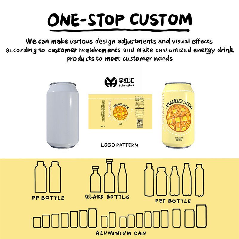 Since its establishment, Yuhonghui has focused on the research and development and production of high-quality beverages, always adhering to the brand concept of "natural, delicious, and innovative". In the raw material procurement link, we have established a strict screening mechanism and cooperated with high-quality raw material suppliers such as mango planting bases for a long time to ensure that every kind of raw material is natural and high-quality. In terms of production technology, we have invested a lot of resources, introduced advanced production equipment, and set up a professional R & D team to continuously explore new flavor combinations and production processes, striving to transform natural raw materials into delicious beverages. We are not only committed to providing high-quality beverages for end consumers, but also can provide customized OEM services according to different customer needs, from product formulation, packaging design to production and delivery, to fully help partners expand their business and achieve win-win results. Choosing Yuhonghui 330ml standard can mango-flavored soda is to choose a refreshing experience that combines natural and delicious, and combines health and enjoyment, making every drink a pleasant journey for both taste and body and mind.