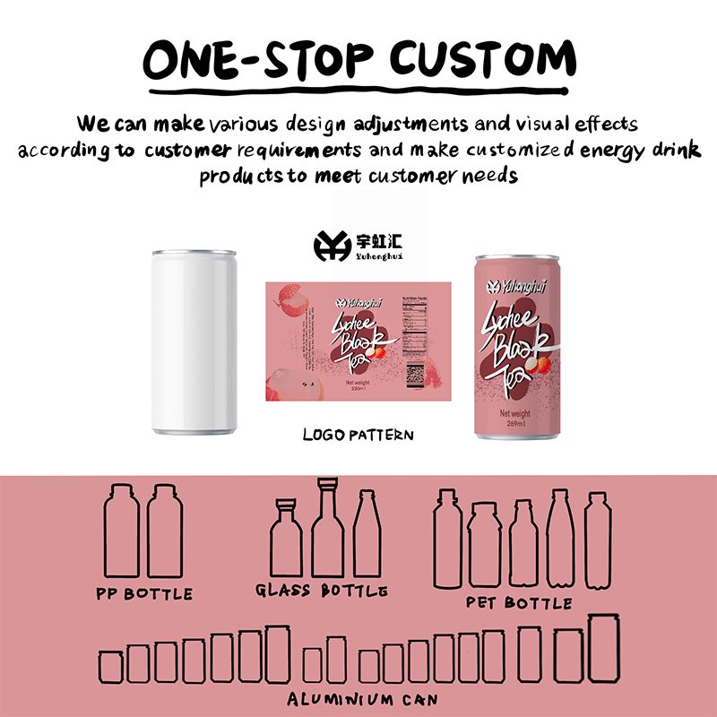 Since its establishment, Yuhonghui has always focused on the research and development and production of high-quality tea drinks, adhering to the brand concept of "natural, healthy, and delicious". In terms of raw material procurement, we have established long-term and stable cooperative relationships with high-quality lychee planting bases and professional black tea suppliers, strictly controlling the quality of raw materials to ensure that every raw material is of high quality and reliable, and ensuring the quality of products from the source. In the production process, advanced production equipment and technology are introduced, and a perfect quality control system is established. From raw material processing to finished product filling, every link undergoes strict testing to ensure product quality is safe and reliable. We are not only committed to providing consumers with delicious tea drinks but also can provide customized services according to customer needs, including product formulation, packaging design, etc., to help partners expand the market and achieve mutual benefit and win-win results. Choosing Yuhonghui lychee black tea drink is to choose a perfect combination of natural, healthy and delicious, making every drink a kind of enjoyment and adding more beauty to your life.