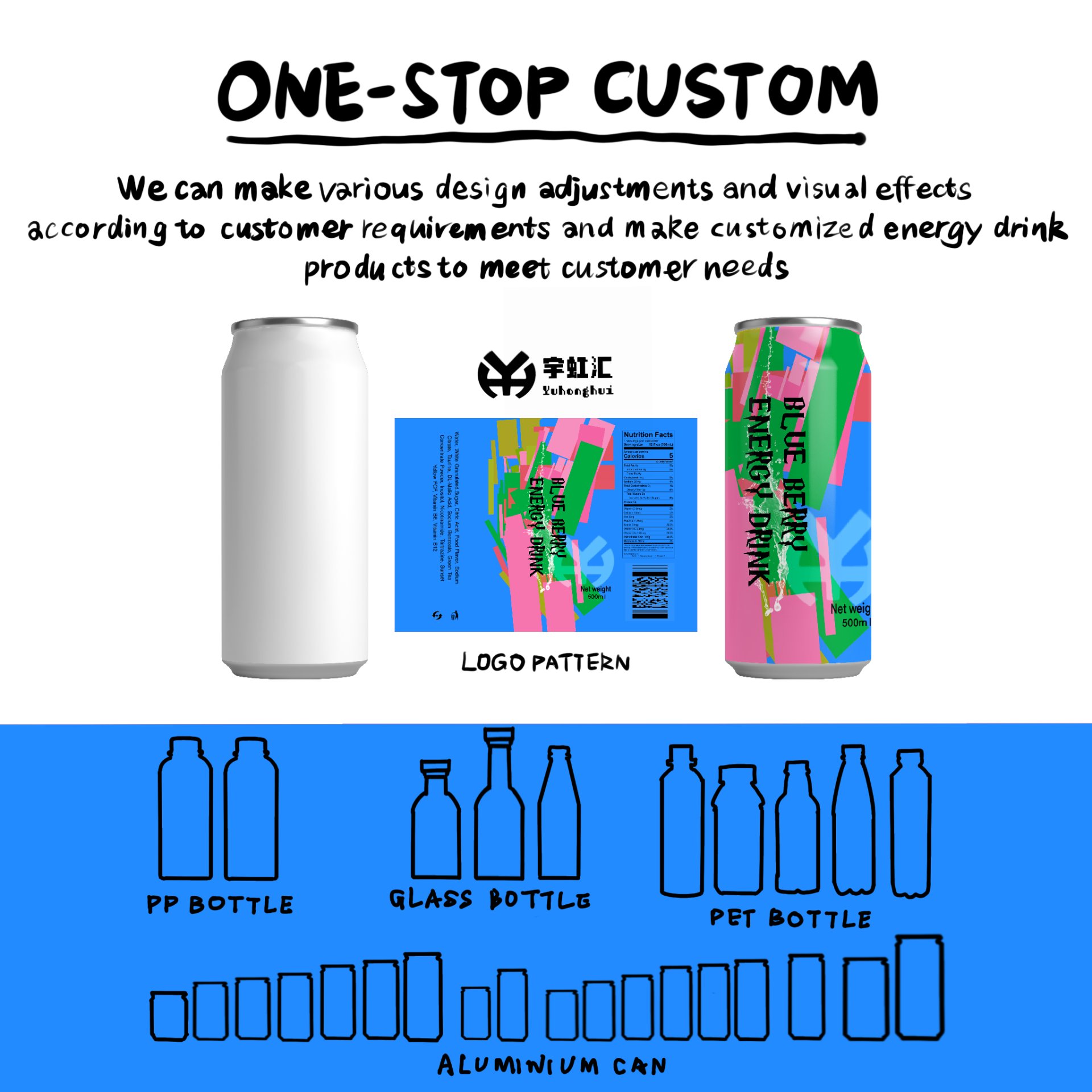Qingdao Yuhonghui presents 500 ml Canned Blueberry Flavored Energy Drink, with core keywords including “Wild Blueberry Cold Extraction Formula, Gentle Long-Lasting Energy Boost, High Anthocyanin Healthy Formula, Export-Grade Aseptic Filling, Customizable OEM/ODM Services”. We carefully select organic wild blueberries from the Greater Khingan Range as the flavor base, which contain twice the anthocyanins of ordinary blueberries; paired with taurine, B vitamins, and other professional energy ingredients, through precise blending in our in-house lab, we achieve a dual experience of “rich fruit aroma” and “gentle energy boost”. Backed by our 100,000-level purification workshop, the entire process from fresh fruit pressing to aseptic filling is fully automated. Each batch passes international authoritative tests such as SGS and FDA, with caffeine content and microbial indicators complying with EU and North American food standards, making it a premium functional beverage customized for global buyers.