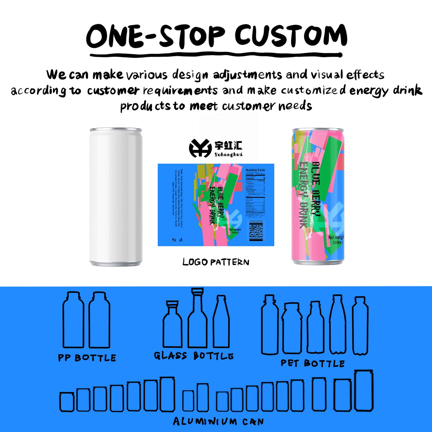 Qingdao Yuhonghui presents 330 ml Canned Blueberry Flavored Energy Drink, with core keywords including “Wild Blueberry Cold Extraction Formula, Gentle Long-Lasting Energy Boost, High Anthocyanin Healthy Formula, Export-Grade Aseptic Filling, Customizable OEM/ODM Services”. We carefully select organic wild blueberries from the Greater Khingan Range as the flavor base, which contain twice the anthocyanins of ordinary blueberries; paired with taurine, B vitamins, and other professional energy ingredients, through precise blending in our in-house lab, we achieve a dual experience of “rich fruit aroma” and “gentle energy boost”. Backed by our 100,000-level purification workshop, the entire process from fresh fruit pressing to aseptic filling is fully automated. Each batch passes international authoritative tests such as SGS and FDA, with caffeine content and microbial indicators complying with EU and North American food standards, making it a premium functional beverage customized for global buyers.