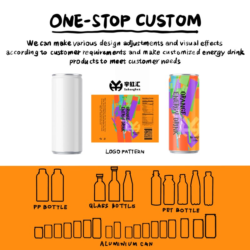 Sunny fresh orange × refreshing bubbles, natural fruit flavor boost, creamy bubbles blend with fresh orange sweetness + clear aftertaste, zero sugar, zero fat, low calorie no burden, mild energy without irritation, scientifically boosts daily vitality, perfectly fits office, light sports, outdoor, study, driving, commute scenes, keeps you energetic all day! This Sleek 330ml Orange Energy Drink ENERGY DRINKS is crafted by a professional functional beverage OEM/ODM source manufacturer, with four core strengths: sunny fresh orange flavor, mild efficient energy, zero sugar healthy formula, full can types full adaptation. It covers all can types: Sleek series (200ml/250ml/269ml/310ml/330ml/355ml/450ml), Standard series (250ml/330ml/355ml/450ml/473ml/500ml), Special shape series (190ml/250ml/1L), Sleek 330ml is the top-selling can, fully adapts to global beverage and drinks packaging needs, highly suitable for B2B demands including beverage customization, functional drinks manufacturing, foreign trade beverage export, healthy drinks private label, cross-border e-commerce exclusive, supermarket channel supply, corporate welfare procurement, gift customization, campus channel, gas station channel. We provide full-link OEM/ODM customization service, from formula R&D, full can types specification to packaging design, export certification, label design, customs documents on-demand exclusive customization, helping brands efficiently enter the global light healthy functional beverage market and create a hit orange flavor energy drinks OEM product! Direct factory supply, free sample testing (freight included), support small batch private label, large batch OEM, foreign trade beverage export customization, mixed specification orders, urgent production. Welcome B2B customers to cooperate!
