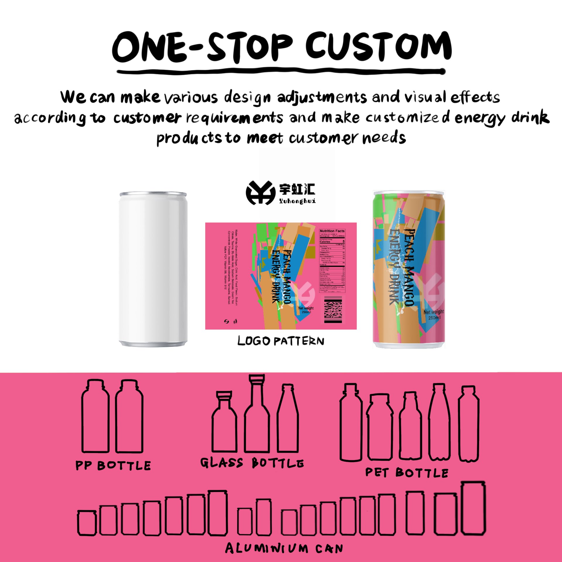 Core Ingredients | Purified Water, Peach Juice Concentrate, Mango Juice Concentrate (total juice content ≥5%), Scientifically Formulated Energy Components (taurine/vitamin B complex/caffeine), Food-Grade Compliant Additives, Carbon Dioxide (support low-sugar/sugar-free beverage customization, adapted to healthy beverage category, no artificial preservatives or synthetic colors) |