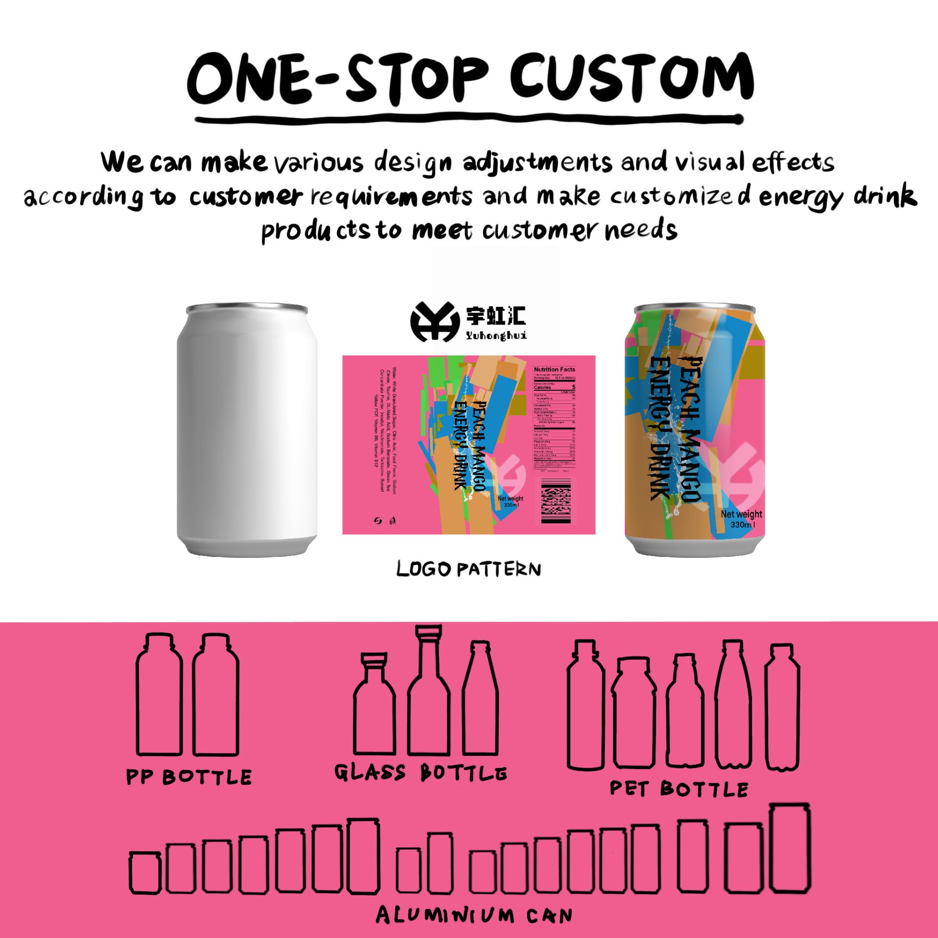 Qingdao Yuhonghui presents 330ml Canned Peach Mango Flavored Energy Drink, with core keywords including “Dual Fresh Cold Extraction Formula of Mengyin Peach & Tainong Mango, Gentle Long-Lasting Energy Boost, High Vitamin C Healthy Formula, Export-Grade Aseptic Filling, Customizable OEM/ODM Services”. We carefully select seasonal Mengyin peaches from Shandong and Hainan Tainong mangoes as the flavor base—peaches have plump, juicy flesh, and mangoes offer rich aroma with moderate sugar content. Paired with taurine, B vitamins, and other professional energy ingredients, through precise blending in our in-house lab, we achieve a dual experience of “sweet fruit aroma” and “gentle energy boost”. Backed by our 100,000-level purification workshop, the entire process from fresh fruit cold pressing to aseptic filling is fully automated. Each batch passes international authoritative tests such as SGS and FDA, with caffeine content and microbial indicators complying with EU and North American food standards, making it a premium functional beverage customized for global buyers.