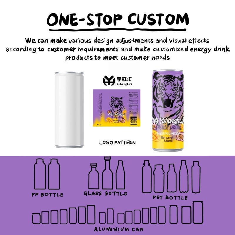 •Packaging Customization: Fully adjustable LOGO, patterns, copy, color matching, supporting original design of high-end brand exclusive beverage packaging, Sleek 330ml slim can can be customized with tropical orange-yellow gradient, mango & passionfruit elements, IP co-branding, trendy text and other visuals, strictly adapting to beverage label specifications of different countries / regions (such as FDA label compliance requirements, including ingredients, nutritional information and allergen prompts), helping B2B customers create exclusive high-end brand vision