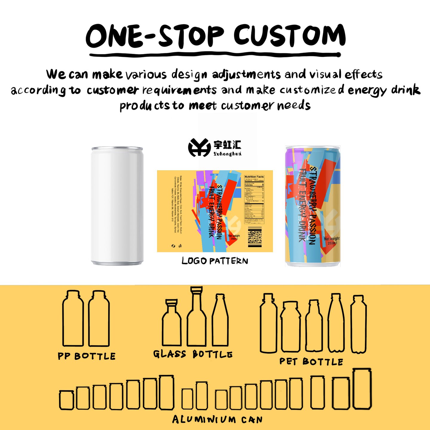 Qingdao Yuhonghui presents 250ml Canned Strawberry Passion Fruit Flavored Energy Drink, with core keywords including “Dual Fruit Fresh Extraction Formula, Gentle Long-Lasting Energy Boost, Zero-Colorant Healthy Formula, Export-Grade Aseptic Filling, Customizable OEM/ODM Services”. We carefully select organic strawberries from the Shandong Peninsula and Qinmi No.9 golden passion fruits from Guangxi as the flavor base, paired with taurine, B vitamins, and other professional energy ingredients. Through precise blending in our in-house lab, we achieve a dual experience of “rich fruit aroma” and “gentle energy boost”. Backed by our 100,000-level purification workshop, the entire process from fresh fruit pressing to aseptic filling is fully automated. Each batch passes international authoritative tests such as SGS and FDA, with caffeine content and microbial indicators complying with EU and North American food standards, making it a premium functional beverage customized for global buyers.